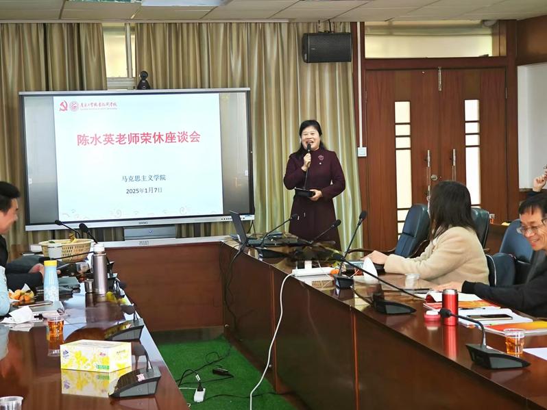 会议的最后,举行了陈水英老师荣休座谈会。陈水英老师在发言中表达了对学院的深切谢意,回顾了自己在教学岗位上的点滴经历,感慨万千。她希望在座的教师们能够继续为学生的成长贡献更多力量。张巧平和刘凤梅分别对陈水英老师多年来的辛勤付出给予了高度评价,表达了深深的敬意和祝福。龙彦、陈婉珍、张夏青等老师也纷纷发言,分享了与陈老师的美好回忆,并祝愿她在退休后生活幸福、安康。