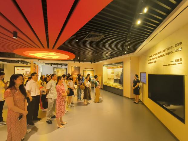 在纪念馆讲解员的带领下,党员们依次走进“上下求索”“凝聚共识”“风起云涌”“理想之光”四大展区。在“上下求索”展区,红船模型的精致工艺与香港海员罢工的历史影像交相辉映,生动再现了中国共产党早期探索革命道路的艰辛历程。步入“凝聚共识”展区,全息投影技术将中共三大会场瞬间“激活”——长桌前代表们热烈讨论的场景栩栩如生,现场解说还原会场代表们推动“党内合作”方针的关键细节。在“风起云涌”展区,互动地图与动态图表使北伐战争的推进路线、五卅运动的全国影响力跃然眼前。而“理想之光”展区则以烈士群像与《从石库门到天安门》艺术长卷收尾,沉浸式光影装置让革命精神的传承更具时空穿透力。