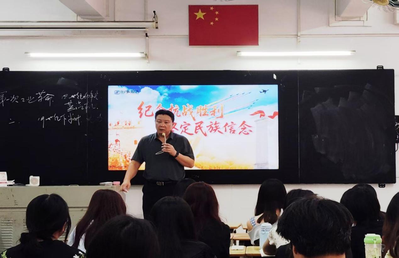 2025年9月22日上午,学校党委委员、副校长孙师家以《纪念抗战胜利 坚定民族信念》为题,在荔湾校区笃学楼507室为2024级视觉设计4班的学生讲授了一堂兼具思想深度与教育价值的专题思政课,引导学生从伟大抗战精神中汲取奋进力量,筑牢信念之基。