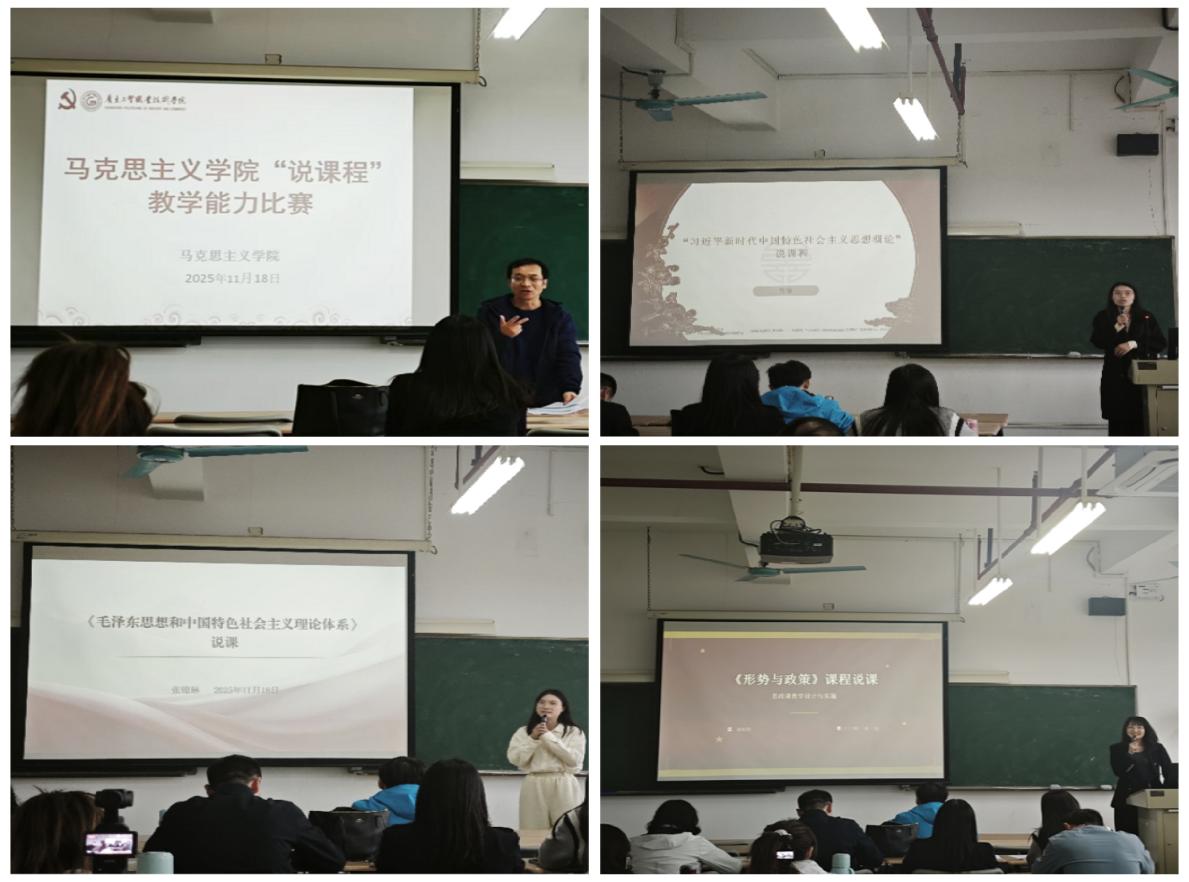 为推进课程改革,加强教师之间的相互交流与学习,提高教师课程建设、教育教学等综合能力。根据新葡的京官网《关于开展2025年“说专业群、说专业、说课程”比赛活动的通知》,马克思主义学院于2025年11月18日举办了院级选拔赛,学院全体教师齐聚现场观摩学习。