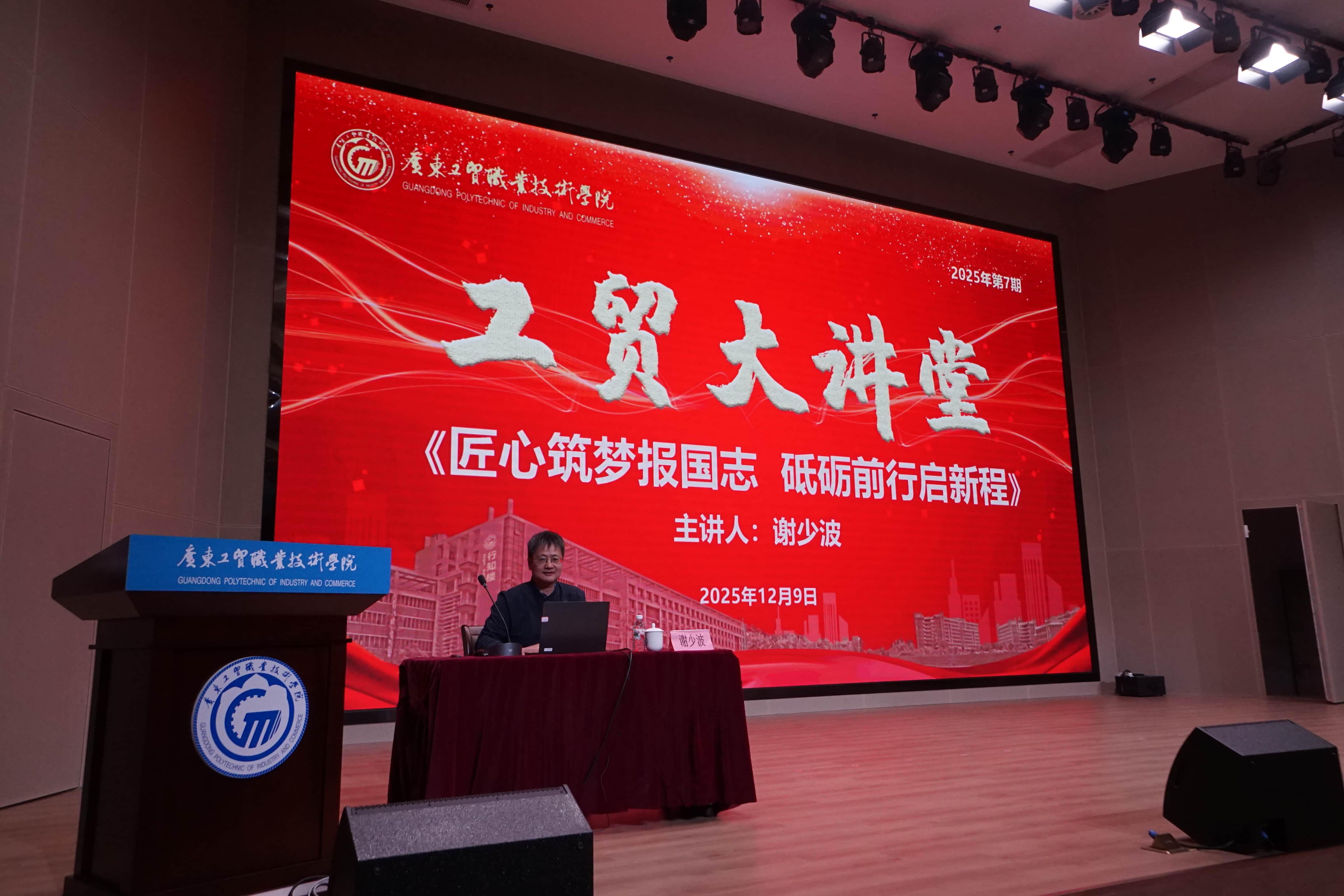 为深入贯彻落实立德树人根本任务,为深化思政教育实践,引领新葡的京官网学子弘扬劳模精神,以榜样力量引领青年学子坚定理想信念、砥砺奋斗品格,激发技能报国的热情,助力学校双高院校建设,2025年12月9日下午,新葡的京集团8814vip在白云校区博学楼一楼学术报告厅成功举办2025年第7期“工贸大讲堂”暨劳模进校园活动。本期讲堂特邀全国劳动模范、全国五一劳动奖章获得者谢少波以“匠心筑梦报国志,砥砺前行启新篇”为主题,为师生带来一场沉浸式的精神洗礼与奋斗启迪。活动由马克思主义学院、学生工作部、关心下一代工作委员会和教学质量监测与评估中心共同组织,学校党委书记何汉武、马克思主义学院院长刘凤梅、学生工作部副部长郭朝明和近500名师生代表参加了活动。