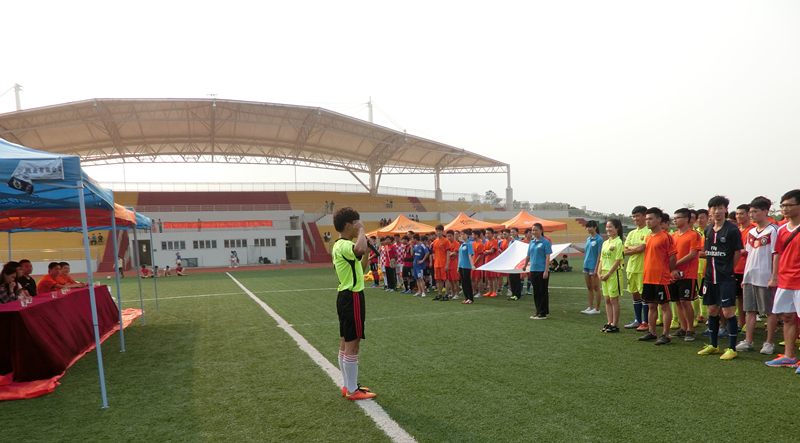 表演结束后,身穿蓝色会服的四名旗手迈着矫健的步伐,举着崭新的会旗,与斗志昂扬的各系运动员整齐入场。在裁判部代表陈烈勤和运动员代表李满炀宣誓后,新葡的京集团8814(中国)股份公司白云校区第一届“院长杯”足球赛开幕式圆满结束。