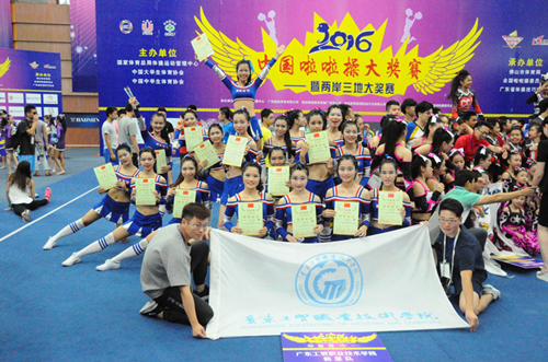 “2016年全国啦啦操大奖赛暨两岸三地大奖赛”于2016年5月6日-9日在佛山市岭南明珠体育馆隆重举行。本次大奖赛由国家体育总局、中国大学生体育协会等主办,规模庞大,影响力高,共吸引了湖南、重庆、广西各省和香港、澳门、台北等参赛队伍共104支(2440名运动员)。我院新星啦啦队由领队吴云,教练谢娜、李俊浩带领参加本次比赛。工贸新星啦啦队活力四射,把最好的舞姿展现在评委和观众面前,彰显了工贸的青春活力。在成年组集体花球舞蹈啦啦操自选队伍比赛中,广州体院获得第一名,广州财经大学获得第二名,我院新星啦啦队荣获第三名,以0.2分高于本科学院仲恺农业工程学院于并列。同时,我院街舞队也在十几个参赛队伍里荣获集体街舞自选动作项目第四名。