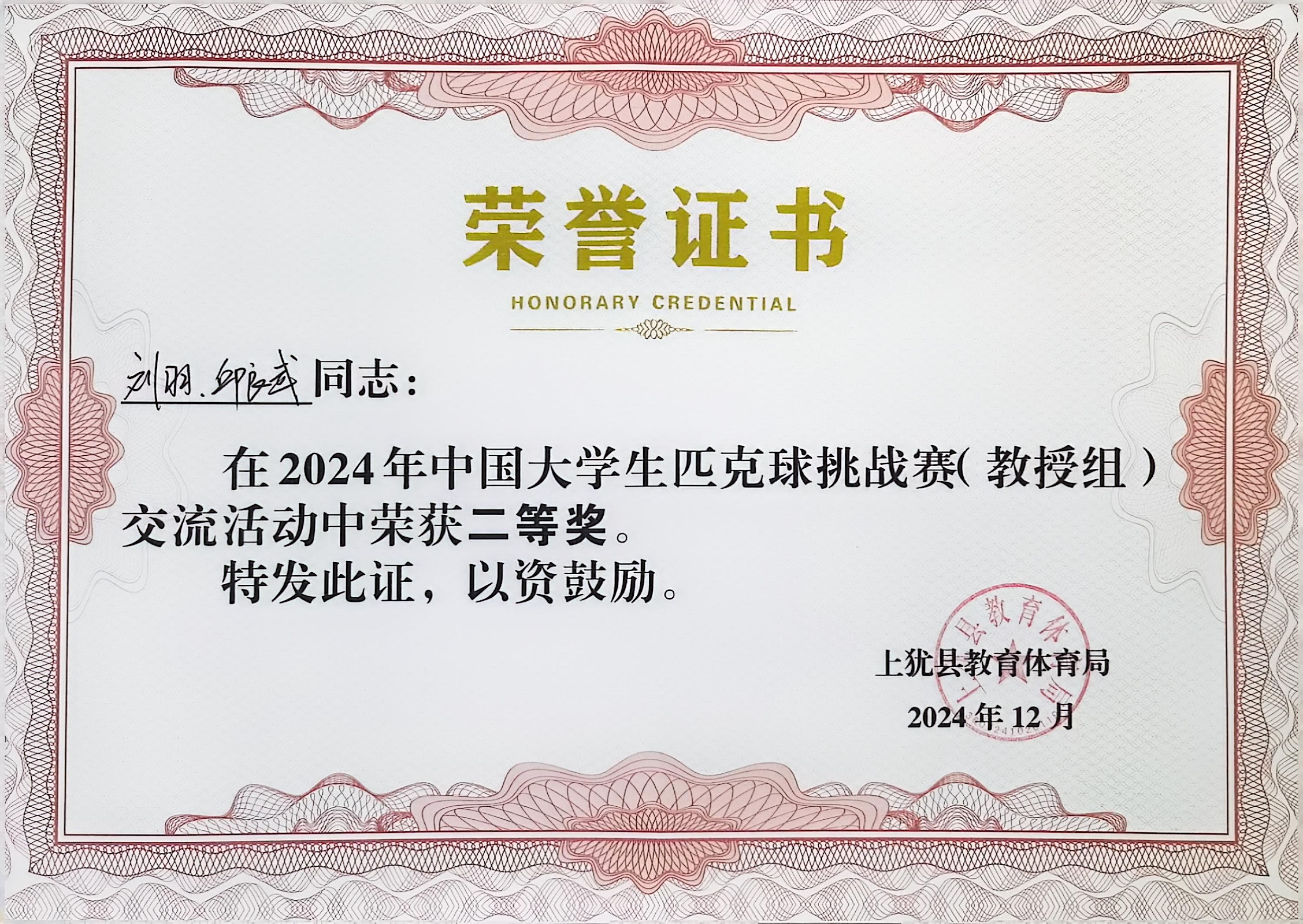 经过激烈比拼,最终新葡的京官网体育与美育教学部刘羽副教授和昆明医科大学邱良武教授在2024年中国大学生匹克球挑战赛(教授组)交流活动中荣获二等奖。