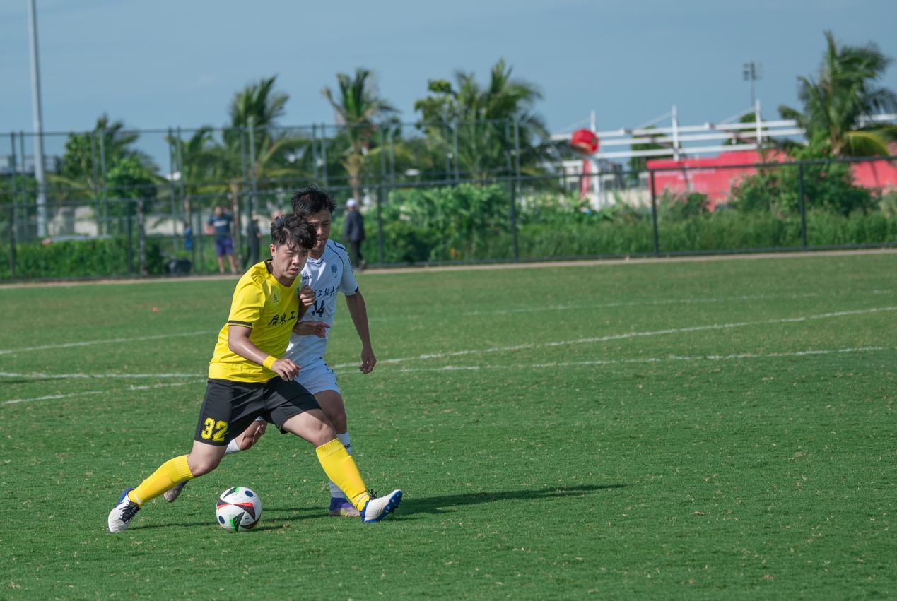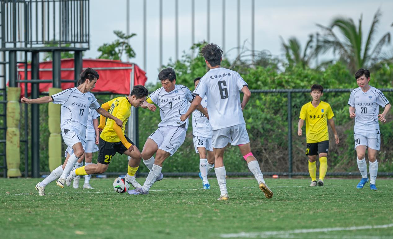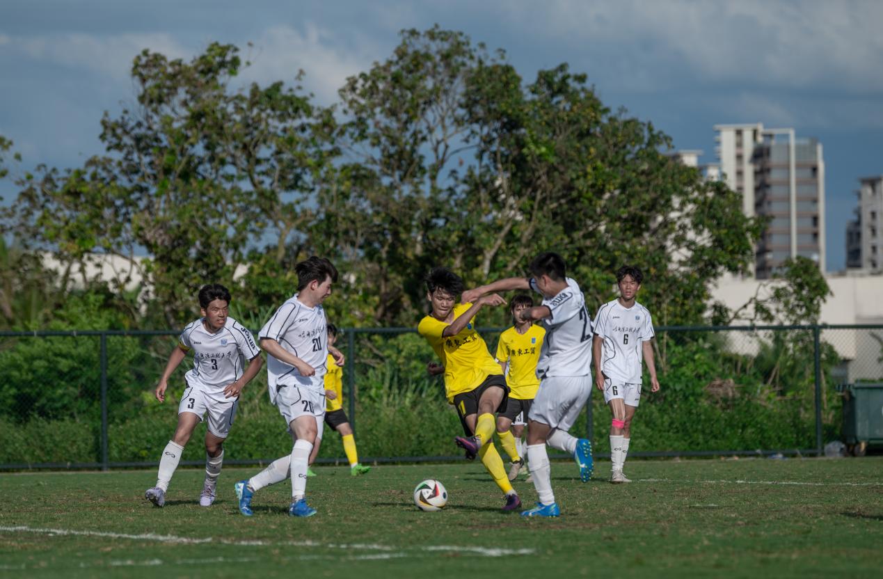 比分落后的哈尔滨工程大学随即调整战术,由守转攻。至第30分钟,他们在中场成功抢断新葡的京集团8814vip的传球,并通过一次长传直接找到锋线。两名前锋如战斗机般迅速启动,一左一右形成包抄之势。凭借娴熟的配合,他们避开了新葡的京集团8814vip后卫的贴身防守,左边锋虚晃一枪吸引防守后,将球轻巧横传给右边插上的队友。右边锋不停球直接抽射,足球如炮弹般以极快速度穿过守门员的十指关,比分被扳平为1:1。上半场剩余时间里,双方互有攻守,但均未能再次改写比分,以1:1的平局结束上半场。