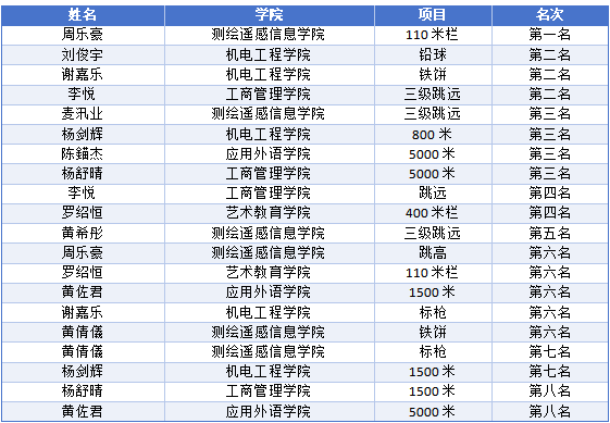 银牌(3项):刘俊宇(机电工程学院)获铅球第二名;谢嘉乐(机电工程学院)获铁饼第二名;李悦(工商管理学院)获三级跳远第二名。