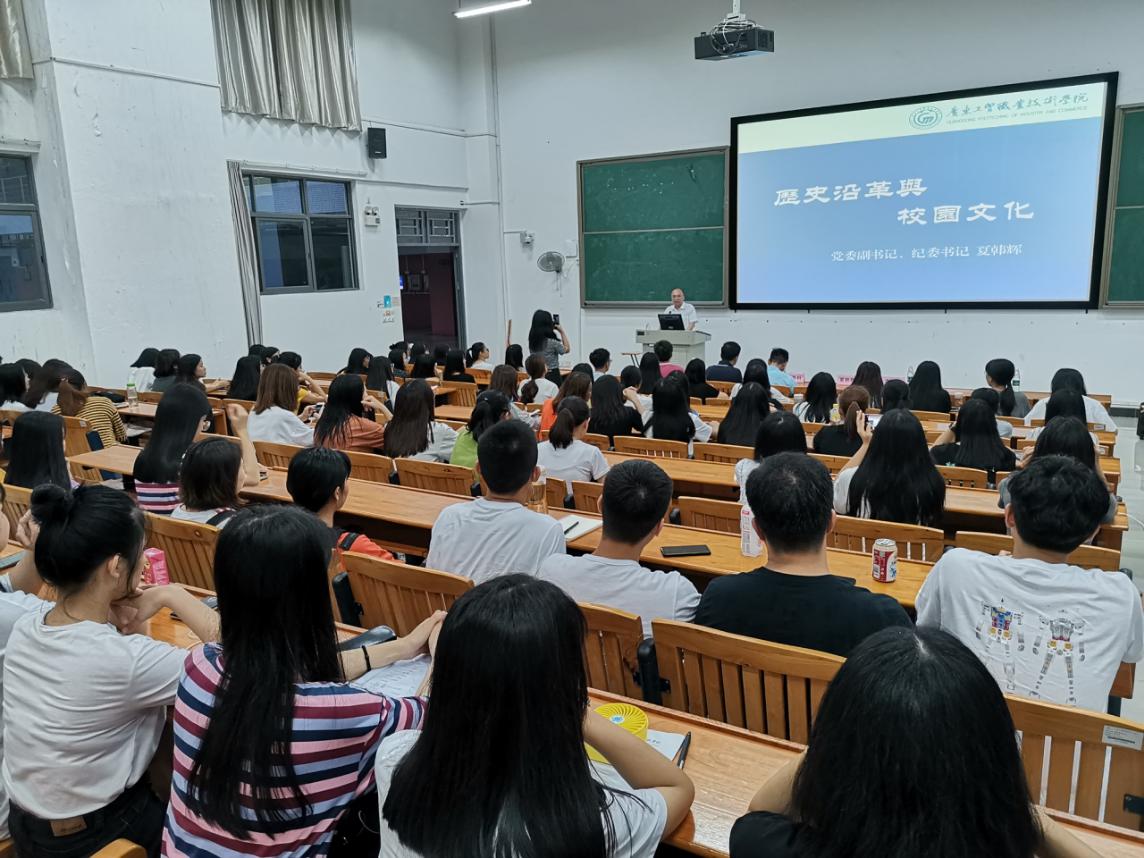 校园文化是学校精神、学校活动、学校秩序和学校环境的集中体现,为进一步提升学生对学校的认同感、归属感及责任感,5月23日,研习所之江社系列活动《历史沿革与校园文化》专题讲座在白云校区2-305举行。讲座由学校纪委书记、党委副书记夏韩辉主讲,应用外语学院党总支书记李德富主持。参加活动人员包括院党总支副书记罗春科、院学工办主任林耀佳、辅导员李迪、全体学生党员、发展对象、积极分子。