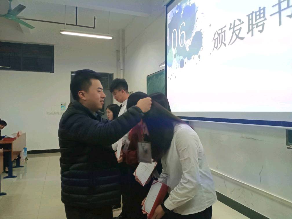 梅昊翔首先欢迎院新成员的加入。他讲到,团委学生会是我院学生工作的主要阵地,需要一批又一批新成员的加入并为之努力奋斗。在日常工作中,我们应当认真负责、善于谋划,既要注重细节,还要具备统筹能力,通过日常工作中不断锻炼自己,服务同学。相信19级新干事会不断成长,蜕变为独当一面的优秀干事。最后,林耀佳老师为在场的干部干事们一一颁发聘书。
