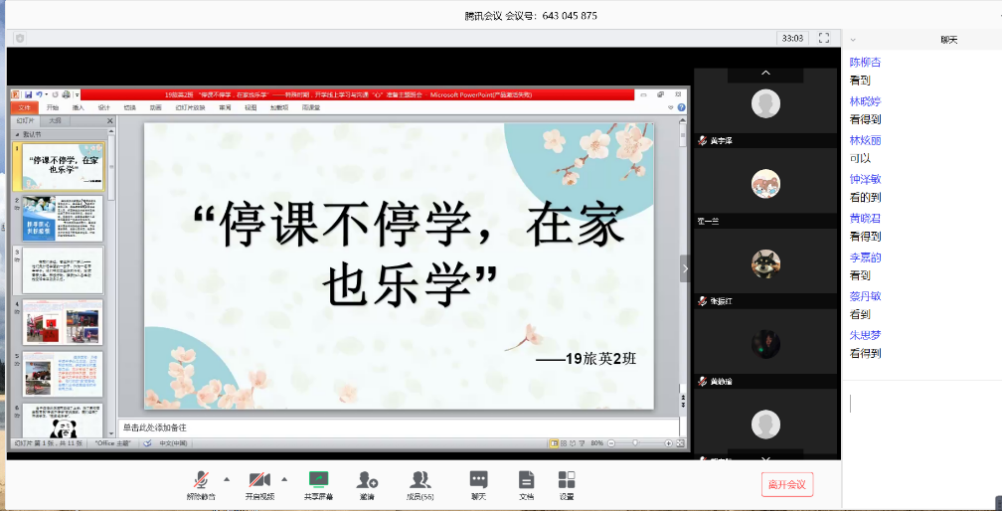线上班会交流中,学生们发自真心的话语,虽简短质朴,却情谊深长。大家认真学习,积极参与到主题班会的讨论,对此次防疫工作有了深入的认识,一致表示将积极配合学校做好线上日常排查统计,自觉遵守学校各项安排,在家认真学习,有条件的积极投身社区防疫志愿者工作,做一名有担当的工贸青年学子。待正式开学之后,大家将继续做好个人卫生,并进行教室、寝室、卫生间等场所的卫生大扫除,赢取此次防“疫”战的最终胜利。