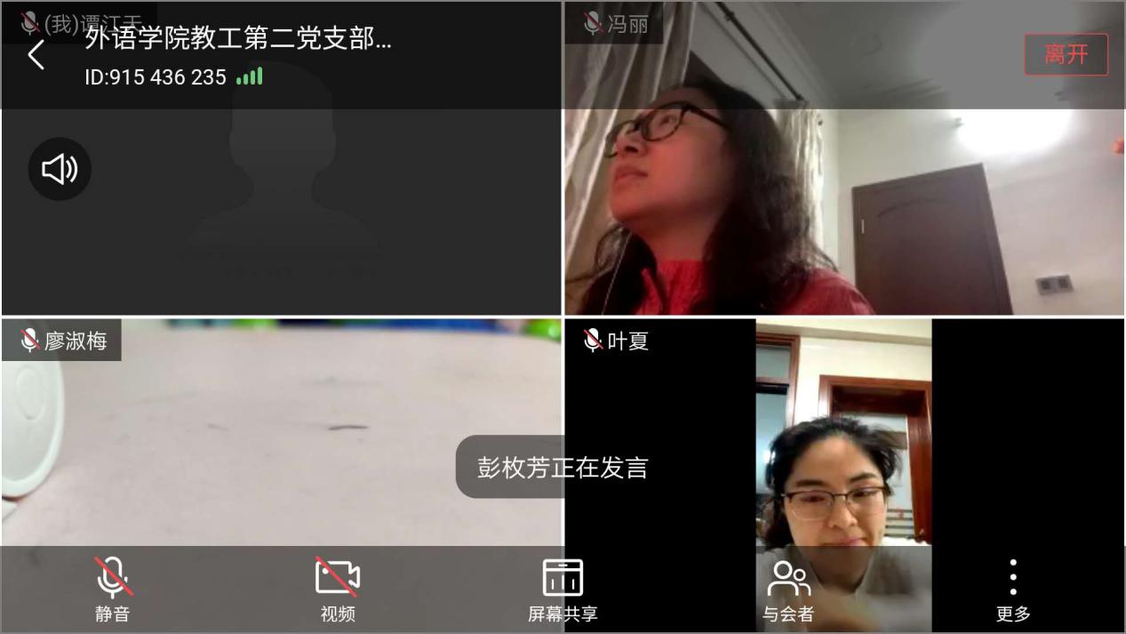 与以往不同的是,这次的会议不在会议室,而是利用“学习强国”开展的一次视频会议。原来,这是外语学院教工第一党支部在此次疫情防控期间开展的线上主题党日活动。