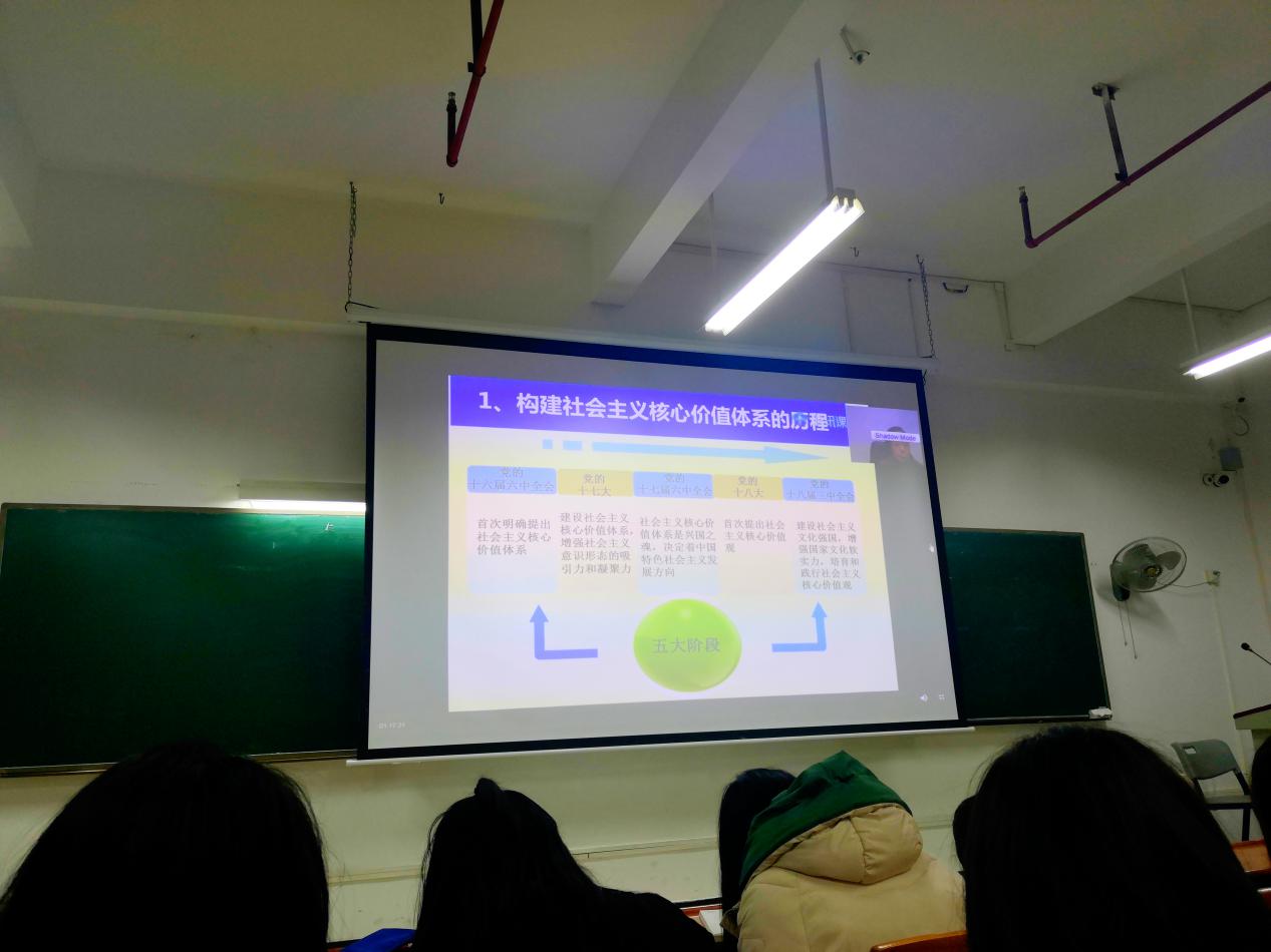 丁教授在课上钟书记在课上带领同学们回顾了习近平总书记的五四运动100周年大会的讲话的内容,并从学习贯彻《习近平谈治国理政》、青年为什么要培育和践行社会主义核心价值观、培育和践行社会主义核心价值观的背景、社会主义核心价值观的内涵以及如何践行社会主义核心价值观等五大方面与同学们进行深入的交流与分享。