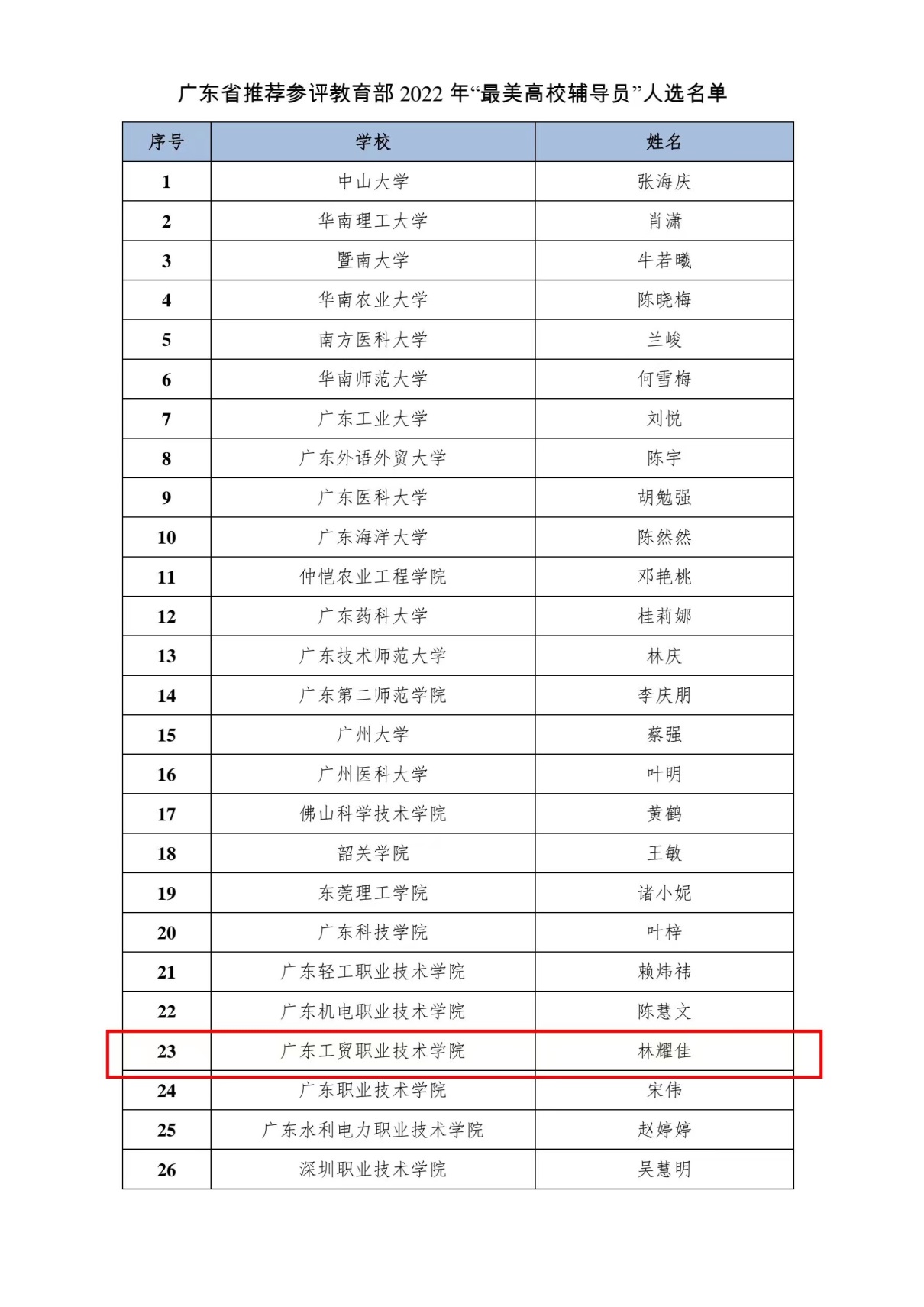 教育厅推荐参评教育部“最美辅导员”名单