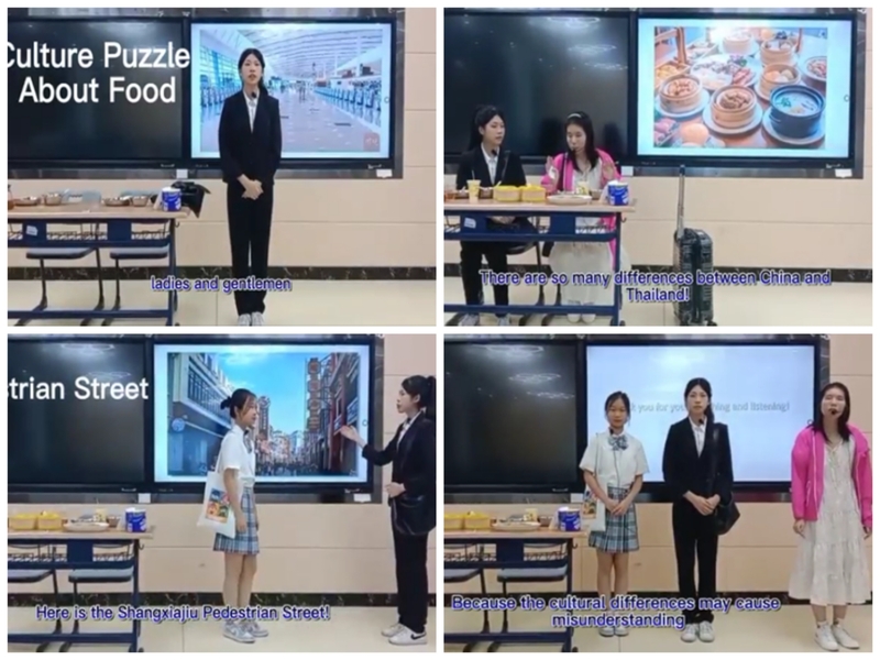 此次比赛要求选手结合自己对跨文化的认识和自身跨文化交际体验,将原创的跨文化交际案例以视频形式进行全英文表演展示。比赛前,指导教师与三位同学在多次讨论后,确定以中国与泰国和日本的文化冲突为主题,围绕“Culture Puzzle About Food”的跨文化冲突开展了情景剧表演,详见以下视频截图。
