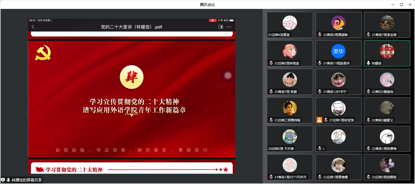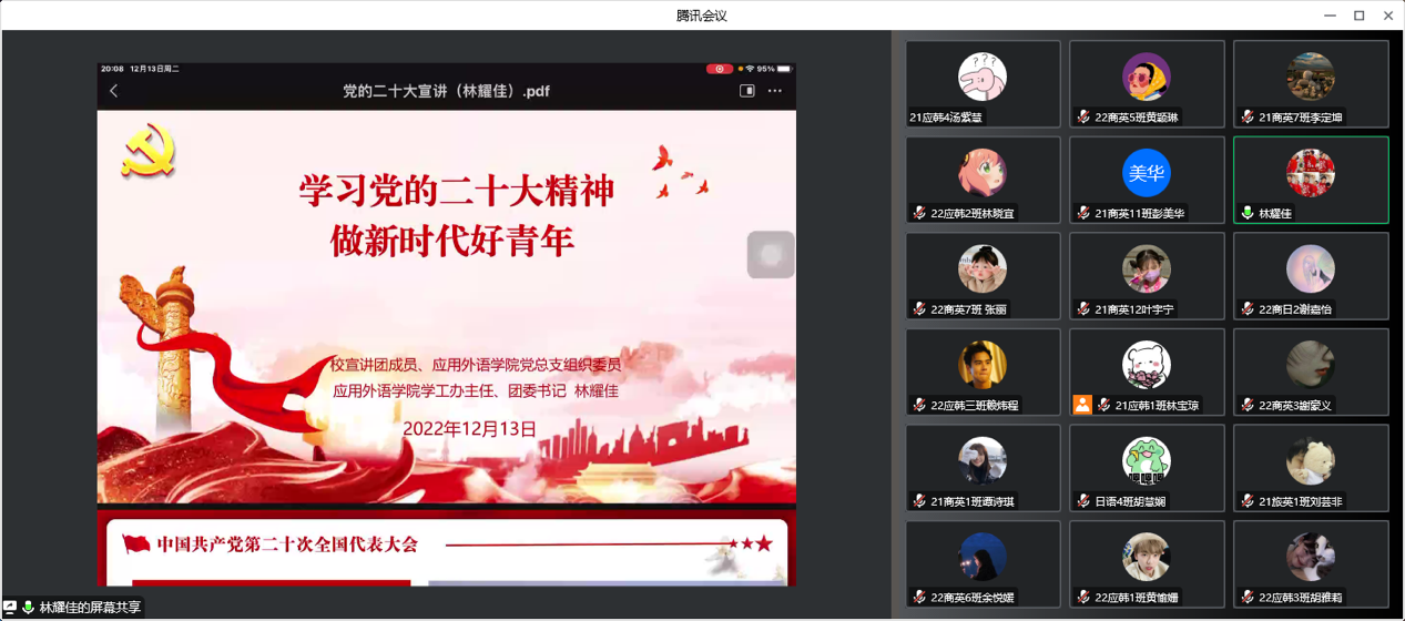 为了学习宣传贯彻党的二十大精神,引领广大青年听党话、感党恩、跟党走。校宣讲团成员,应用外语学院党总支组织委员、学院学工办主任、团委书记林耀佳老师于2022年12月13日晚为应用外语学院各班级团支部支委成员、团委学生会工作人员及青马班成员开展了党的二十大精神宣讲活动。本次活动同时也是党团课的组成部分,活动主题为:学习党的二十大精神,谱写应用外语学院青年工作新篇章。