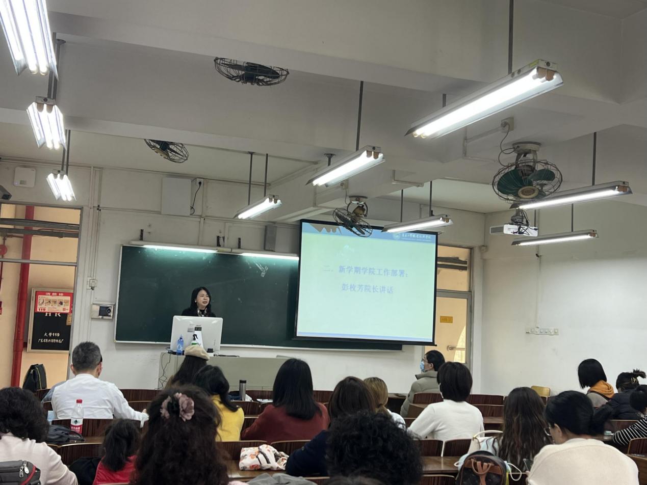 对接学院教科研及未来发展,学院院长彭枚芳全面总结了2022年学院教育教学工作情况,部署了2023年学院重点工作,指导广大教师从善学、善谋、善成三个方面入手,从政治引领,教师发展,产教融合,人才培养,教学改革,社会服务,国际交流七大方面罗列了应用外语学院2023年重点任务清单,鼓励全体教师勠力同心,与时俱进,开拓创新,不断提升学院教师的业务能力和育人水平,始终保持“昼无为,夜难寐”的精神状态,为双高校建设团结奋斗。