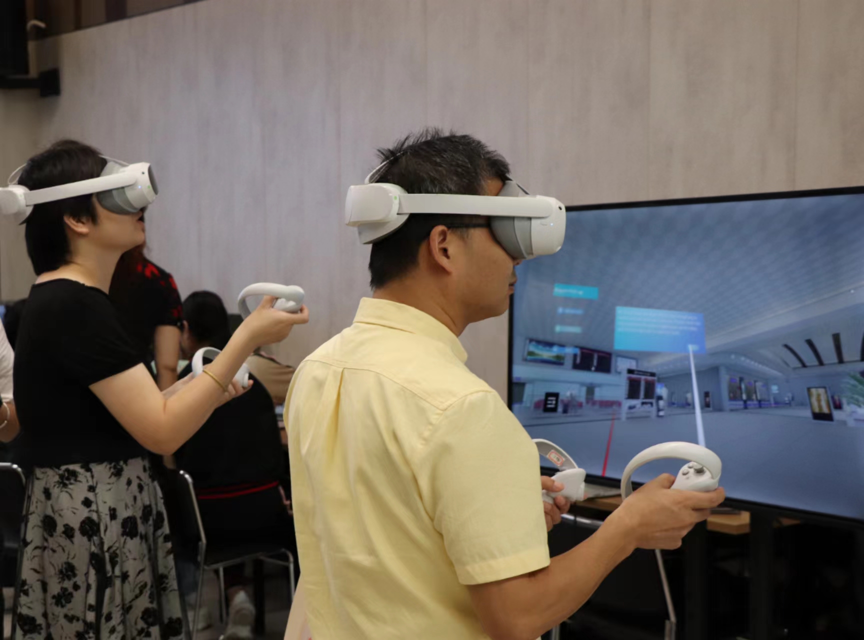 本次实操设备由广州卡瑞欧教育科技有限公司提供,学员们亲身体验了现实世界中难以实现的“实操”机会,学习了VR虚仿、智能AI等前沿技术,还从学员角度体验了利用高科技设备担当跨境电商主播的全过程和PC、VR头盔等多端设备全面融入场景的学习情境。实操现场,学员们不时发出惊叹声和欢笑声。