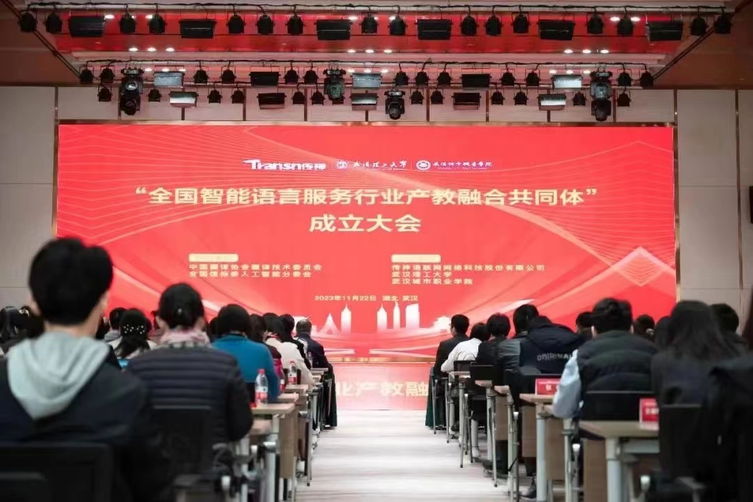 出席和莅临现场的领导和嘉宾主要有中国外文局翻译院副院长、中国翻译协会翻译技术委员会副主任委员王飞,湖北省商务厅服务贸易处副处长葛怀,武汉市教育局一级调研员李万平,武汉市商务局服务贸易处副处长彭皓园;还有共同体牵头单位的武汉理工大学党委副书记、纪委书记夏江敬,武汉城市职业学院党委副书记、校长张英,传神语联网网络科技股份有限公司创始人兼董事长何恩培。以及来自智能语言服务行业的企业、高校、科研机构等单位的二百余位代表共济一堂,现场气氛热烈。在与会成员的共同见证下,大会表决通过了《全国智能语言服务行业产教融合共同体章程》,确立了共同体组织机构名单,举行了第一届理事单位、常务副理事单位、副理事单位的授牌仪式和共同体启动仪式。