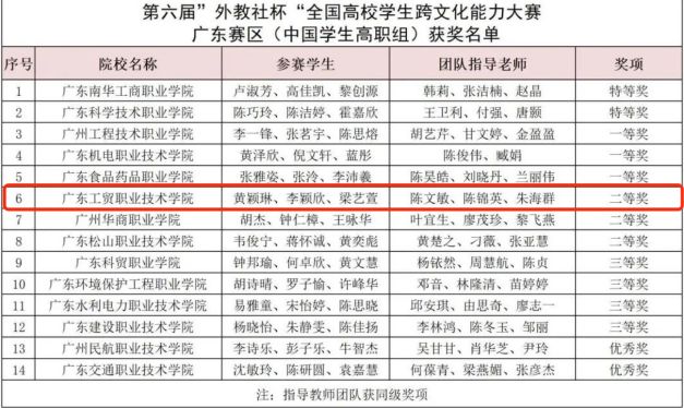 11月25日,在第六届“外教社杯”全国高校学生跨文化能力大赛广东赛区中新葡的京官网22商英5班黄颖琳、22国贸1班李颖欣和22工设5班梁艺萱三名同学组成的团队荣获二等奖,应用外语学院陈文敏老师、陈锦英博士和朱海群老师获得优秀指导教师奖。