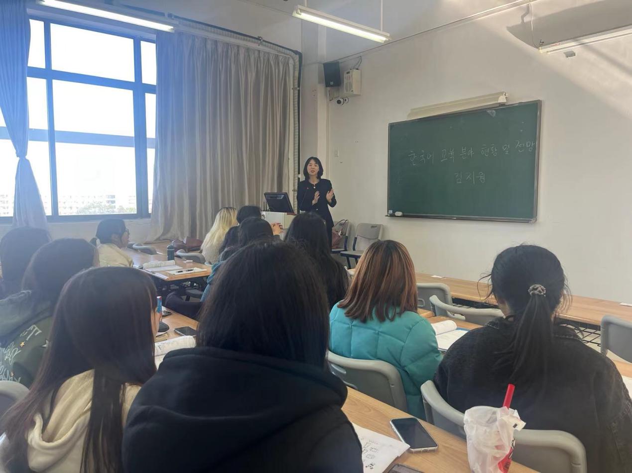 作为此项目的重磅嘉宾,韩国高端专家金智媛博士深入的解析韩语教育问题,分享韩语教育的最新发展趋势、教学方法和评估体系等方面的知识和经验。此外,从专业定位、课程设置、实践教学等方面提出了韩语专业建设相关的建议。应用韩语专业23届新生参与此次讲座,专家与新葡的京官网韩语专业学生进行互动交流,共同探讨韩语教育的未来发展方向。