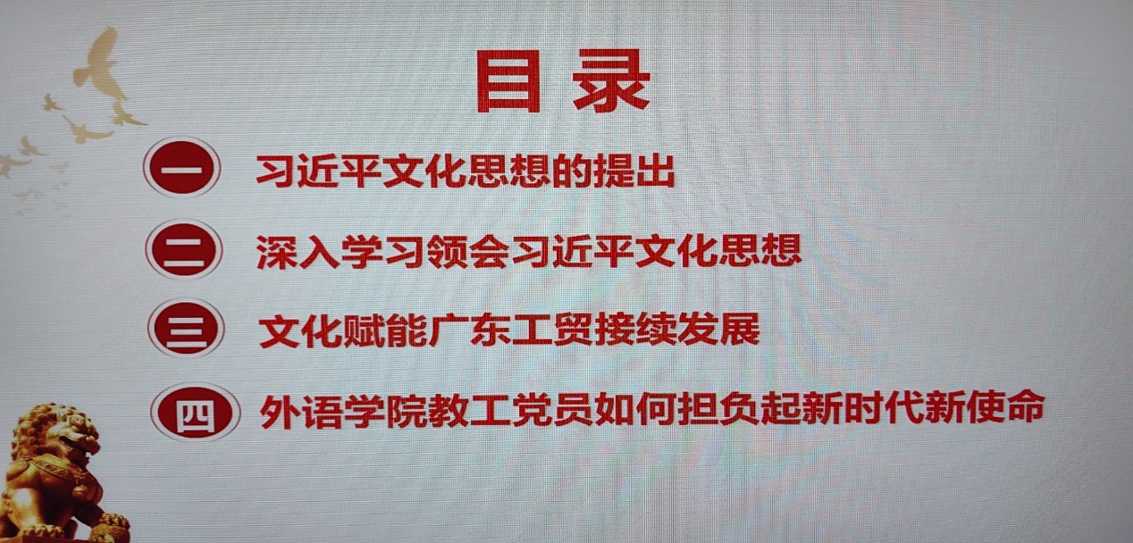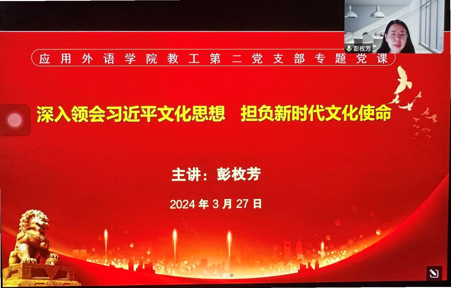 为了加强教师党员的使命担当,提升党员教师队伍的党性修养,3月27日,应用外语学院教工第二党支部举办了一场别开生面的线上专题党课。此次党课主题为“深入领会习近平文化思想,担负新时代文化使命”,旨在通过学习中华优秀传统文化,提升教工党员的文化素养,增强文化自信,推动学院文化建设。本次党课由应用外语学院院长彭枚芳主讲。