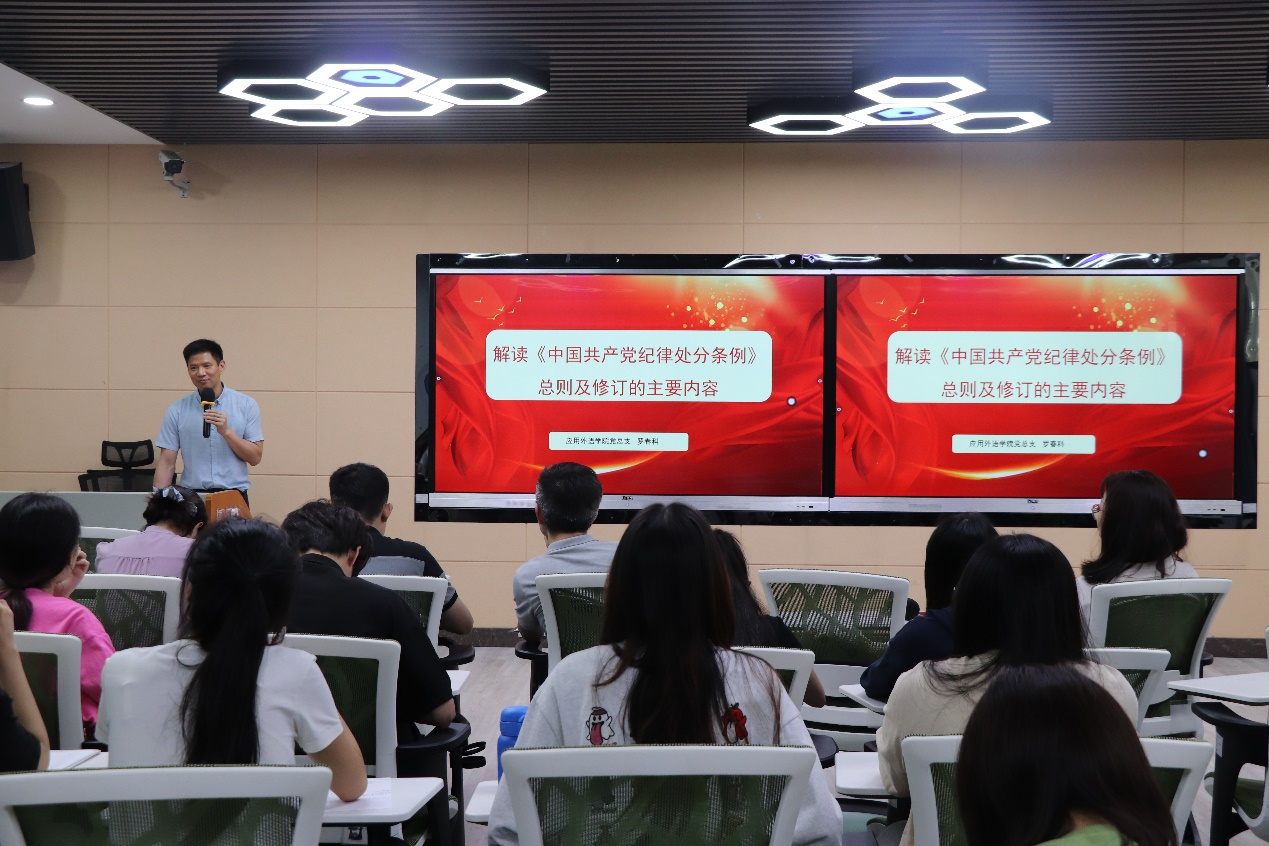 罗春科从条例内容、案例教学、交流研讨等方面带领全体师生党员深入学习《中国共产党纪律处分条例》。首先,罗春科以解读《条例》为切入点,结合当前形势和学院实际,深入剖析了党员在党性修养和纪律意识方面存在的问题和不足,提出了加强党性锻炼、提高政治觉悟的具体要求。随后,通过生动的案例和深刻的分析,罗春科引导参会党员深入思考如何在日常工作中践行党的纪律和规矩,如何将学习成果转化为推动学院发展的实际行动,做到自觉学、主动学、深入学。最后他呼吁各位党员同志将《条例》记入脑融入心。党员们纷纷表示,本次党课内容丰富、深入浅出,既有理论高度,又有实践指导,使大家受益匪浅。