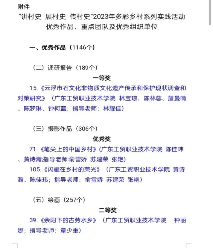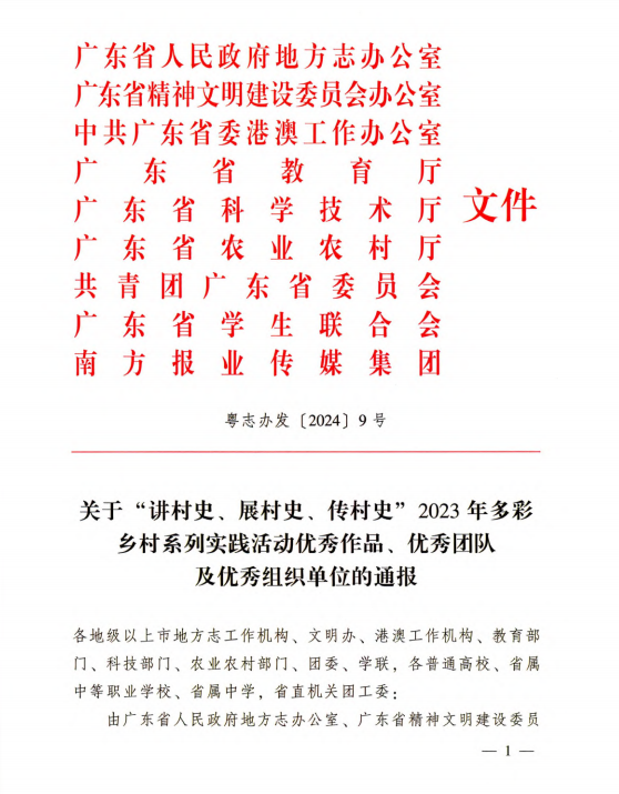 近日,由广东省人民政府地方志办公室、广东省教育厅、团省委等九部门联合组织开展的“讲村史 展村史 传村史”2023年多彩乡村系列实践活动公布评选结果,新葡的京集团8814vip师生获调研报告一等奖1项、绘画作品二等奖1项、摄影作品优秀奖2项。学校荣获优秀组织单位。