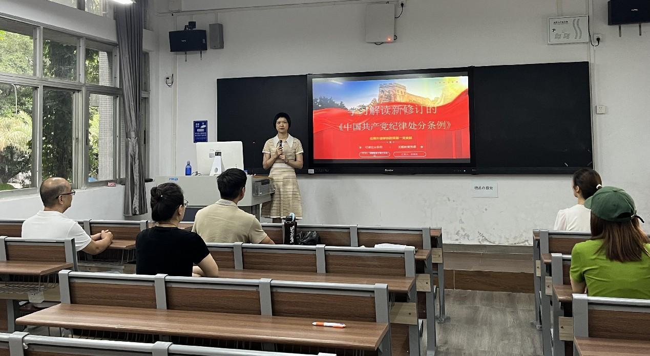 陈锦英带领教工第一支部党员以解读《条例》为切入点,指出深入学习《中国共产党纪律处分条例》,一是要坚决纠治形式主义、官僚主义;二是要督促干部勇于担当、积极作为;三是要促进党员履职尽责、规范用权;四是要推动精准问责。陈锦英结合当前形势和学院实际,深入剖析了党员在党性修养和纪律意识方面存在的问题和不足,提出了加强党性锻炼、提高政治觉悟的具体要求。随后,通过生动的案例和深刻的分析,罗春科引导参会党员深入思考如何在日常工作中践行党的纪律和规矩,如何将学习成果转化为推动学院发展的实际行动,做到自觉学、主动学、深入学。最后他呼吁各位党员同志将《条例》记入脑融入心。党员们纷纷表示,本次党课内容丰富、深入浅出,既有理论高度,又有实践指导,使大家受益匪浅。