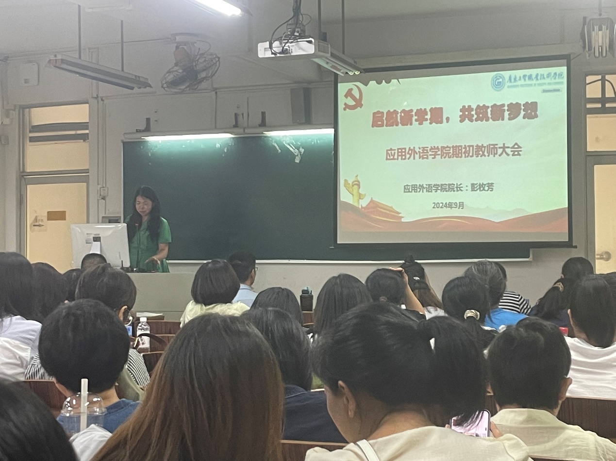 为扎实推进应用外语学院高质量发展,实现新的跨越,9月1日应用外语学院在天河校区西区406召开全体教职工大会。学校党委委员、副校长唐毓秋,学院党总支临时负责人罗春科,院长彭枚芳,副院长胡红玲,学工办主任林耀佳及全体教职工参加会议。本次会议由林耀佳主持。