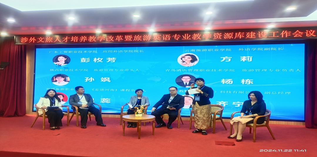 会议期间,彭枚芳院长主持了圆桌论坛,深圳职业技术大学创新创业学院副教授吴维、云南旅游职业学院外语学院副院长方莉、陕西职业技术学院旅游管理专业带头人孙飒副教授、青岛酒店管理职业技术学院旅游管理专业负责人杨栋副教授、郑州旅游职业学院旅游外语学院《走近河南》课程负责人魏蕊老师、中教畅享(广东)科技有限公司副总经理齐宁博先生分别分享了开发建设数字化课程和建设旅游英语专业资源库的经验,为资源库建设提供了宝贵的指导和启示。