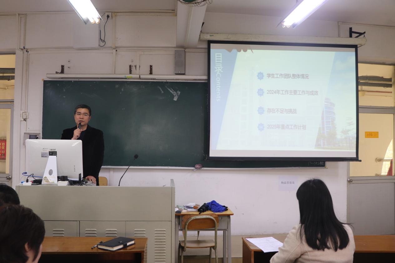 郑楚生副书记围绕学工团队整体状况、2024年度主要工作成效、现存短板与面临挑战,以及2025年度重点工作计划四个方面展开汇报。他介绍道,学生党支部在党建工作方面,通过一系列扎实举措,实现了工作质量的显著提升,高质量发展了56名政治素质过硬的学生预备党员,成功筑牢了坚强的战斗堡垒,同时以党建为引领推动“双百”行动,与多方开展结对共建,收获了累累硕果;在就业工作方面,积极构建“大就业”格局,为学生就业创业的可持续发展提供有力赋能,结合学院自身特色精准施策,在征兵入伍工作上成绩斐然,亮点突出;辅导员队伍建设也稳步推进,扎实有力推动了学生发展相关工作。同时,郑楚生也指出当前存在的不足与面临的挑战,并提出应对措施,进一步明确了2025年的重点工作计划,他表示要继续深化党建引领,强化思想教育;优化就业服务,提升就业质量;加强心理健康教育,守护学生心灵健康;推进 “一站式” 学生社区建设,促进学生全面发展。