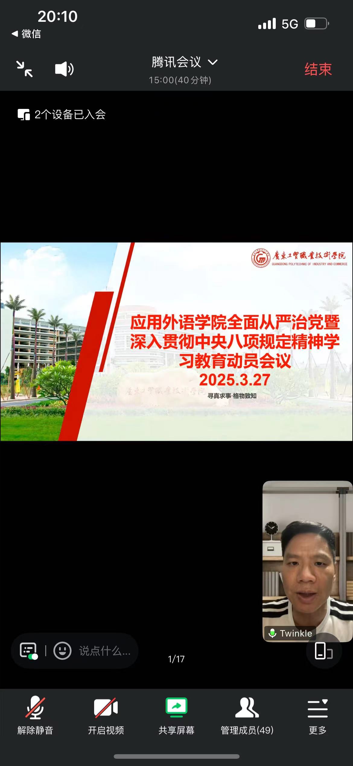 3 月 27 日,应用外语学院召开深入贯彻中央八项规定精神学习教育动员部署会议,深入学习贯彻习近平总书记重要讲话和重要指示精神,传达学习党中央、省委关于开展深入贯彻中央八项规定精神学习教育的有关文件和会议精神,学习贯彻学校党委《关于开展深入贯彻中央八项规定精神学习教育的工作方案》。部署会由外语学院党总支书记罗春科主持,党总支支委及各党支部负责人参会。
