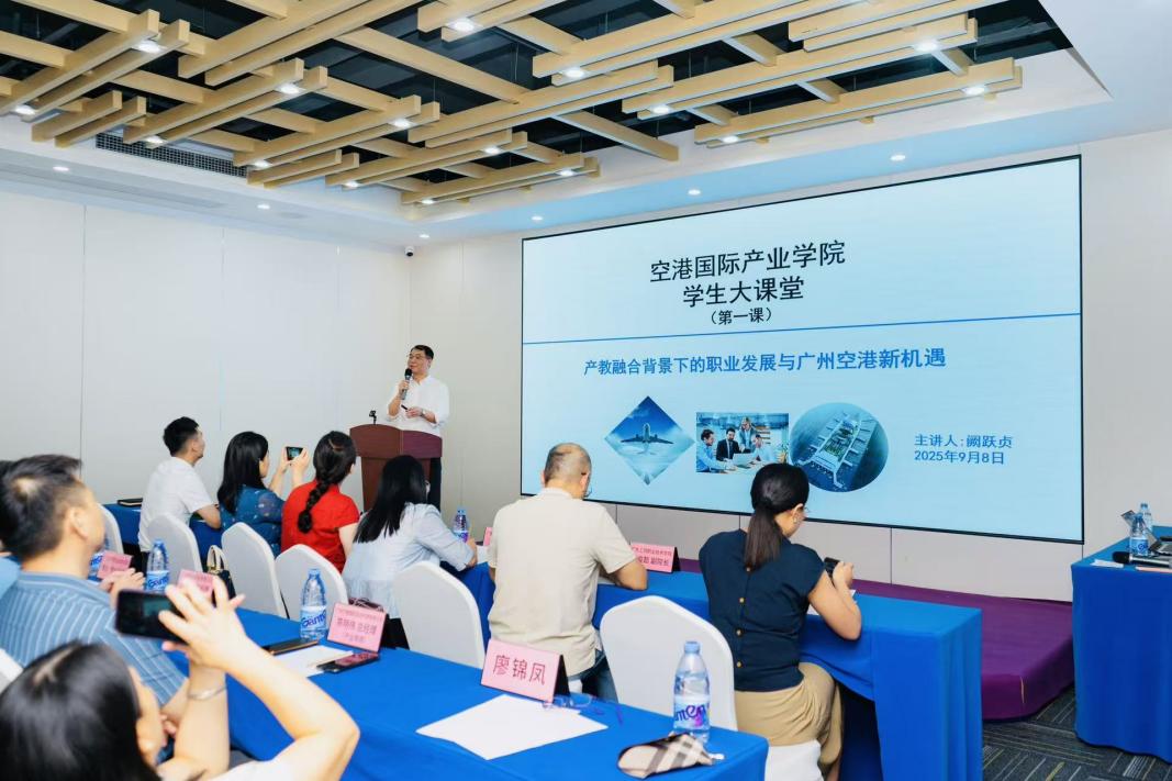 随后,广州空港国际产业学院林文雄执行院长围绕学院发展方向与人才培养目标发言,强调“实战型人才”的培养定位;紧接着,广州空港国际产业园阙跃贞总经理带来《产教融合背景下的职业发展与空港新机遇》专题讲座,从职业素养、行业前景和学习要求三个维度为学子们答疑解惑;最后,典礼以《学生行为规范与安全管理》培训收尾,为学生实习期间的安全与规范保驾护航。