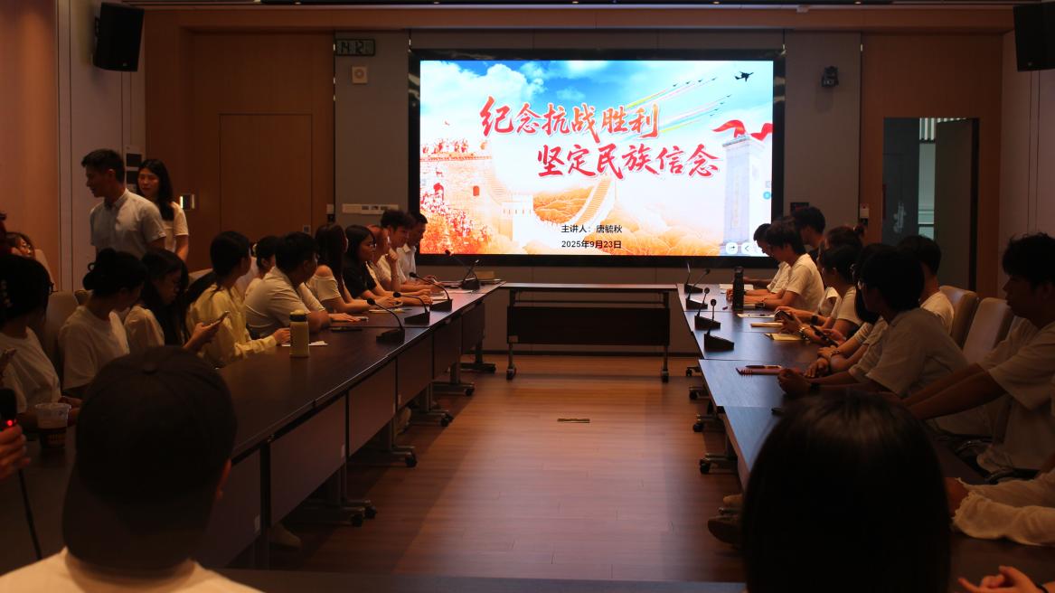 9月23日,学校党委委员、副校长唐毓秋在图书馆627会议室开展以“纪念抗战胜利,坚定民族信念”为主题的思政课,应用外语学院与经济贸易学院学生代表共同参会,师生一同回顾抗战历史,传承伟大抗战精神,明确新时代使命担当。