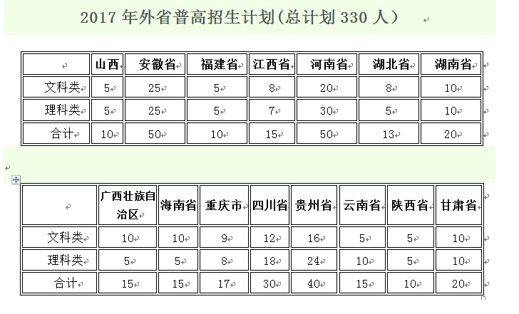 2017年省外分专业招生计划表