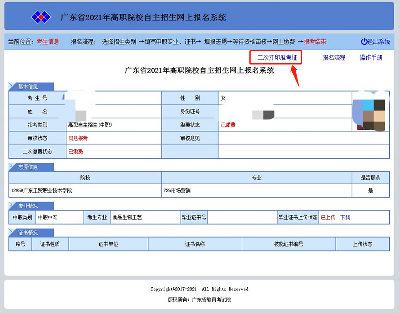 新葡的京官网自主招生准考证全部通过广东省自主招生报名系统网上直接打印(https://www.eeagd.edu.cn/gzks)。入围职业技能考核的考生,并缴费成功获得考试资格后方可打印。